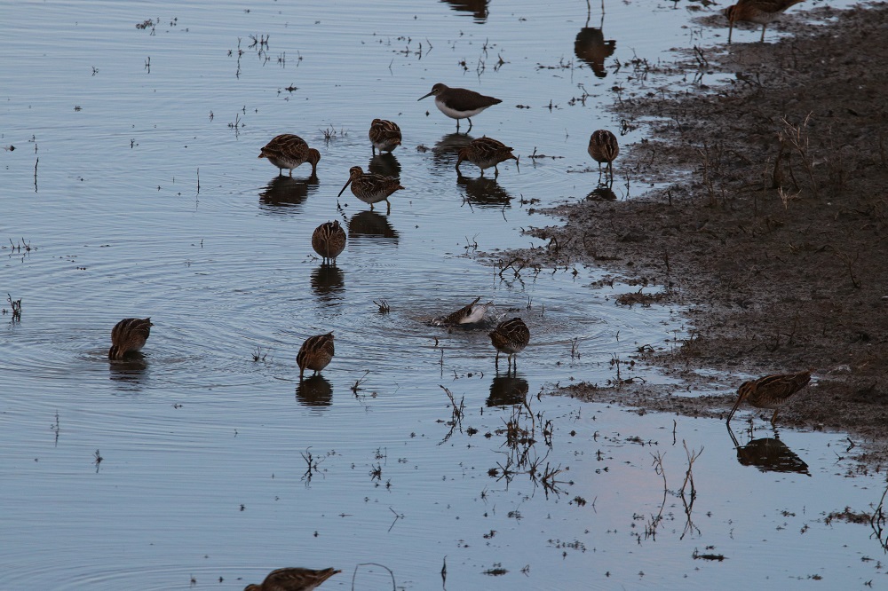 Tatsächlich konnte ich von der Hütte am Berwicker Weg viele Limikolen beobachten. Ich war schon öfter dort und habe gelegentlich Günter P. Reinartz und seine Frau Gudrun getroffen. Aber so viele Limikolen wie heute, beobachtete ich dort noch nie! So z.B.: 1 Alpenstrandläufer, 2 Grünschenkel, nicht gezählte Bruchwasser-, Waldwasser- und Flussuferläufer. Bekassinen waren mit mindestens 20 Exemplaren sehr häufig vertreten. Nebenbei sah ich mindestens 5 diesjähriger Flussregenpfeifer, 14 Kanadagänse, davon 3 flugunfähige, viele Bachstelzen, 3 Stieglitze, 1 Grünfink, >10 Stockenten, 5 Rostgänse, rund 90 Stare und mehr als 10 Kiebitze.