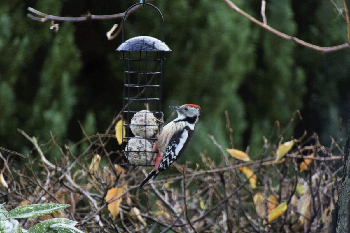 Neben dem häufigen Besuch zweier Buntspechtpaare haben wir erfreulicherweise nach längerer Abwesenheit nun schon zweimal wieder einen Mittelspecht am Knödel gesehen – zuletzt am 23.11. Am 18.11. – just einen Tag vor dem Frostbeginn – kam ein Grünspecht-Weibchen und stocherte ausgiebig nach Ameisen.