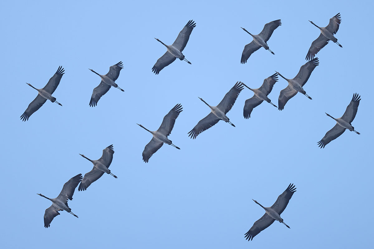 Gemischter Kranich- und Kormorantrupp über die Hemmerder Wiesen fliegend (Foto: Hartmut Brecher)