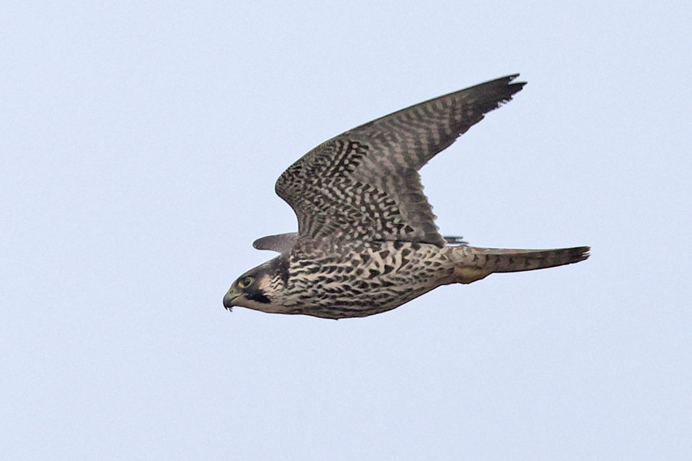 Wanderfalke verlässt nach seiner Mahlzeit die Hemmerder Wiesen (Foto: Hartmut Brecher)