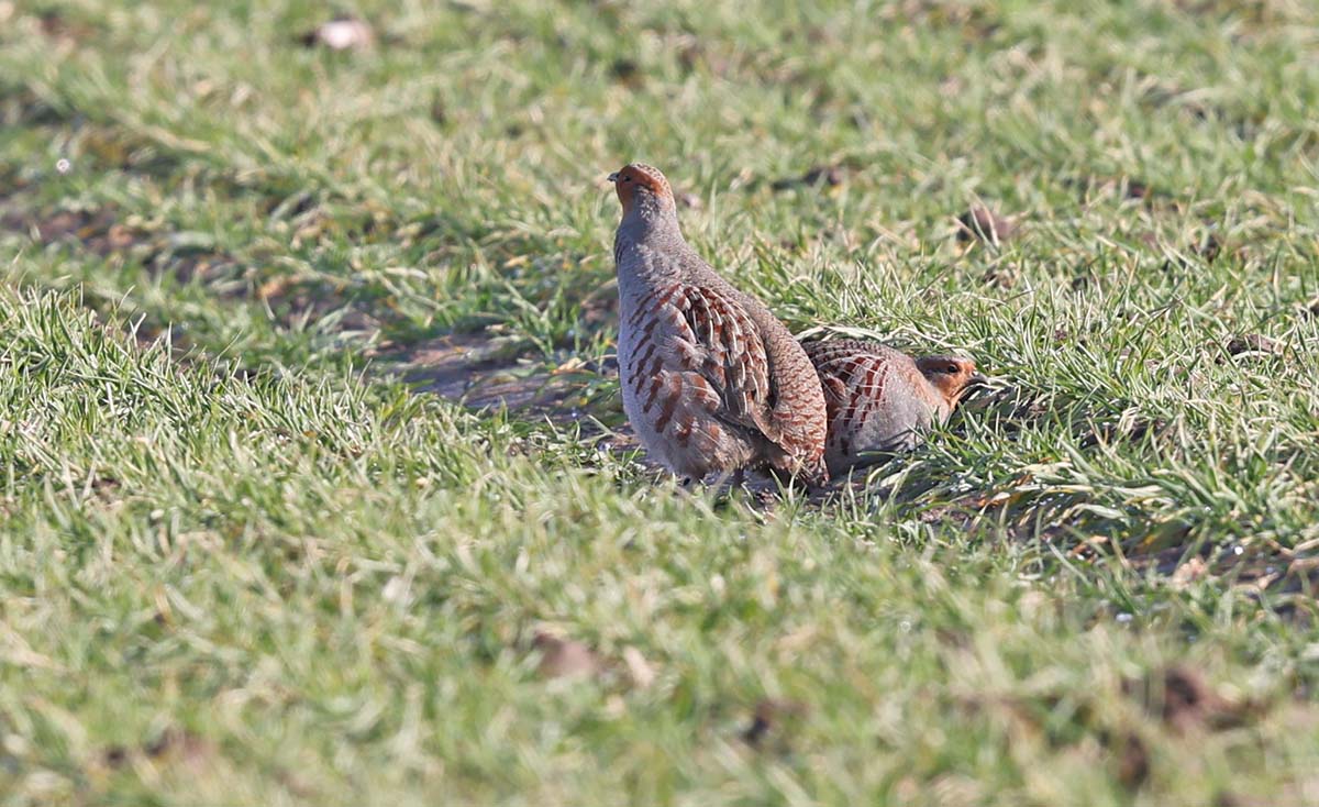 Auf der Büdericher Haar (SO) ein Rebhuhnpaar. Bereits vor einer Woche (13.01.) konnten auch im Hemmerder Ostfeld 12 Rebhühner auf einem Rapsfeld ausgemacht werden.
