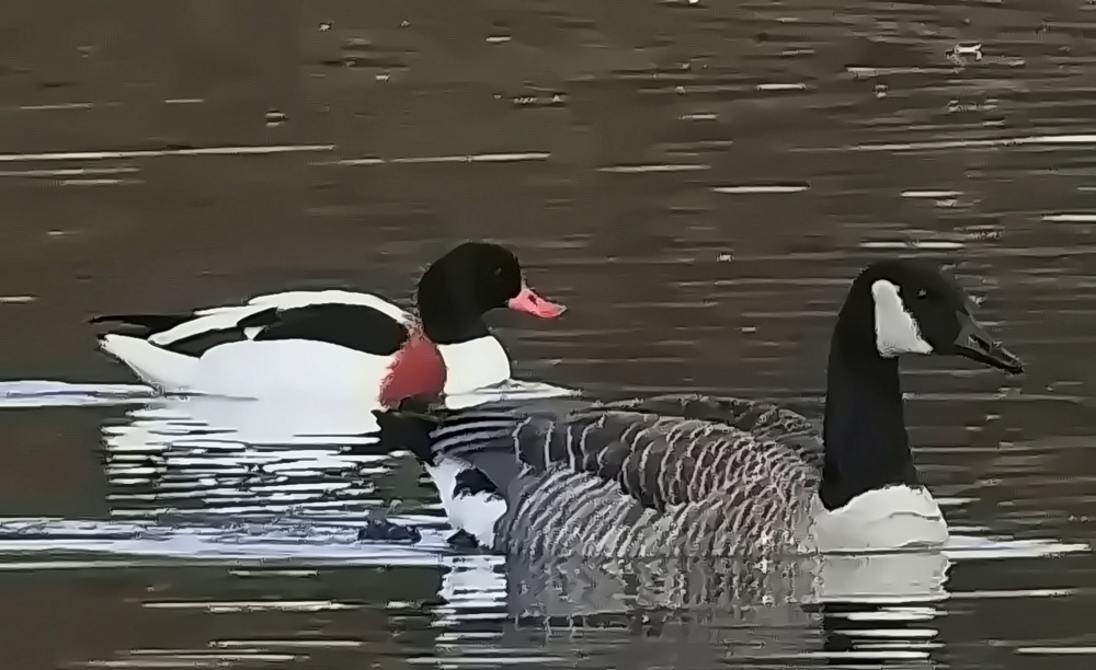 Vom alten Aussichtshügel aus konnten wir folgendes beobachten: 26 Kanadagänse, 2 Graugänse, 2 Nilgänse und ca. 100 Blässgänse, unter denen laut Merlin-App mindestens eine Kurzschnabelgans hätte gewesen sein sollen. Ehe wir die Gänseschar jedoch näher unter die Lupe nehmen konnten, überflog ein Hubschrauber das NSG. Während Kanada-, Grau- und Nilgänse entspannt blieben, flüchteten alle Blässgänse inklusive der möglicherweise auch anwesenden Kurzschnabelgans. Tja, Pech gehabt.