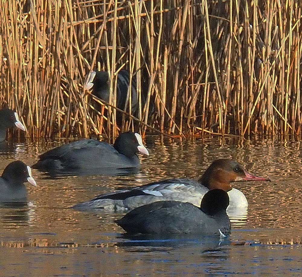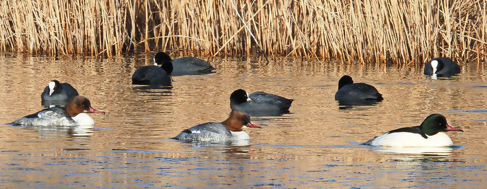 Am Tibaum flogen am Vormittag drei Gänsesäger ein, darunter zwei weibliche Tiere.
