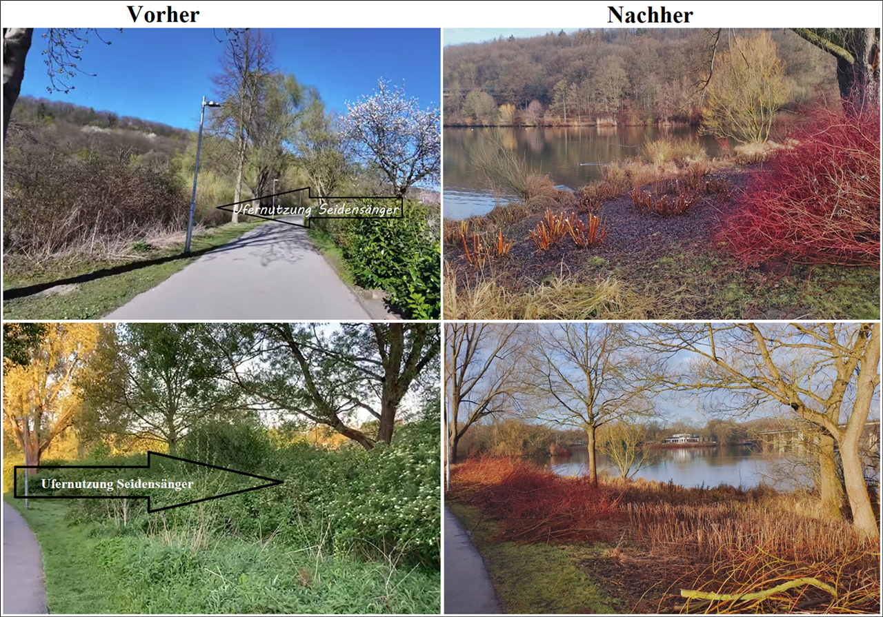 Trotz der wertvollen fachlichen Unterstützung durch die Abteilung Umwelt- und Klimaschutz der Stadt Iserlohn, die sich engagiert für den Erhalt dieser Strukturen eingesetzt hat, kam es im Zuge der regulären Gewässerunterhaltung zu weitreichenden Rückschnitten. Wo letztendlich genau das Problem lag, bleibt rein spekulativ. Dabei war der Erfolg dieses historischen Brutnachweises ursprünglich zweifelsfrei eng mit einer spezifischen Managemententscheidung verknüpft: Um die Verschmutzung der ufernahen Gehwege durch Gänseexkremente im Sommer zu reduzieren, wurden die Uferzonen seit 2022 auf Empfehlung der zuständigen Fachbehörden als eine von mehreren Maßnahmen zur Bestandsregulierung der Kanada- und Nilgans bewusst der Sukzession überlassen. Ziel war es, durch dichte Vegetationsriegel den direkten Zugang der Gänsefamilien vom Wasser zu den Kurzgrasflächen zu unterbinden. Diese ursprünglich rein pragmatische Maßnahme zur Konfliktvermeidung entwickelte sich zu einem wertvollen ökologischen Synergieeffekt, der erst die notwendige Deckung für die Ansiedlung des Seidensängers schuf. Dies belegt eindrucksvoll, welches Potenzial bereits in der kleinräumigen Förderung natürlicher Dynamik in semi-urbanen Räumen steckt und wie diese zu bemerkenswerten Ansiedlungserfolgen führen kann. Eine ökologisch orientierte Pflegepraxis bietet die Chance, Sukzessionsflächen verstärkt als funktionale Bestandteile des Ökosystems zu begreifen, statt sie lediglich als Defizit in der Gewässerunterhaltung einzustufen. Bedauerlicherweise zeigt die aktuelle Situation am Seilersee ein anderes Bild. Wer so viel Zeit und Leidenschaft investiert, um diese flüchtigen Momente der Natur zu dokumentieren, erkennt oft schmerzlich, wie fragil solche Erfolge sind, wenn fachliche Weitsicht an behördeninternen Schnittstellen oder festgefahrenen Pflegeroutinen scheitert.