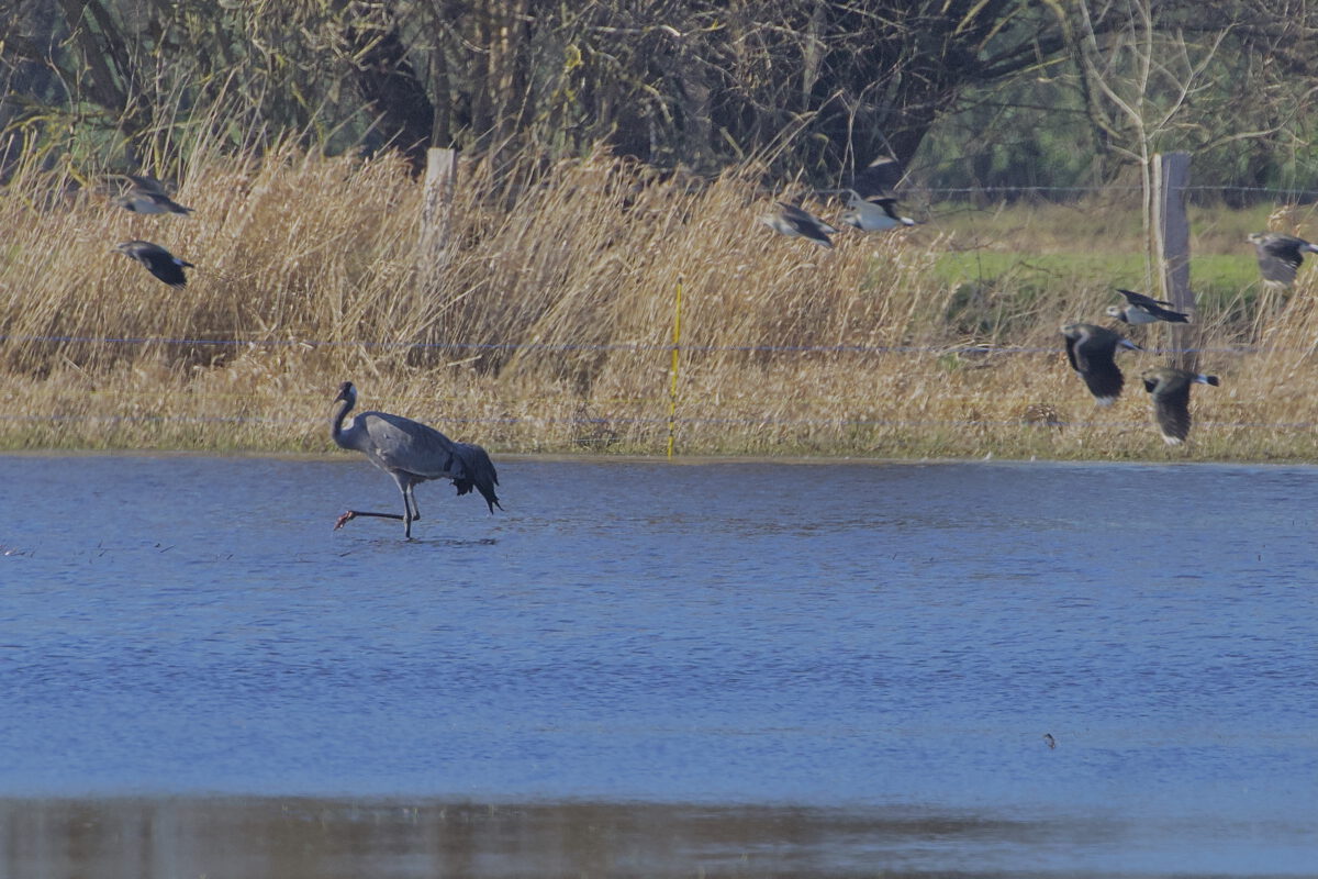Einzelner Kranich mit Kiebitzen in den Hemmerder Wiesen. Ist sein Fuß in Ordnung? Leider ist das Bild nicht schärfer. Ein Löffelentenpaar zwischen den Stockenten.Die Bläßhühner stecken ihr Territorium ab.Die Störche wird der neue Elektrozaun gegen Bruträuber nicht abhalten. Ein zweiter Storch stand auf dem Nest bei Louven. Einer von mindestens 4 Silberreihern.