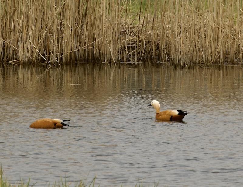 Abseits der auffälligen Artenzugänge lohnt ein genauerer Blick auf die Wasservögel der Vernässungsfläche. Hier lassen sich Phänomene dokumentieren, die oft nur als Randnotiz wahrgenommen werden, jedoch eine biologische Variabilität offenbaren. Einerseits hält sich seit über einem Jahr zwischen Stockenten ein intersexuelles Individuum auf, das Mischmerkmale von Männchen und Weibchen aufweist, was bei Stockenten beispielsweise durch hormonelle Störungen oder genetische Faktoren entstehen kann (vgl. AVES Braunschweig 2 (2011), Abb. 21-22, S. 27–28: https://www.club300.de/publications/014_hybrids/AVES_Wasservogel-Hybriden_von_J_Lehmhus.pdf ). Andererseits hielten sich seit dem gesamten Winter regelmäßig bis zu 3 Höckergänse (domestizierte Form der Schwanengans) mit einer weißen Hausgans auf. Am Sonntag kopulierte eine Höckergans ♂ mit der Hausgans ♀. Sollten beide Individuen – wie aufgrund ihrer phänotypischen Merkmale zu vermuten ist – der Gattung Anser angehören, wäre aus dieser Verbindung gemäß der einschlägigen Literatur (u. a. AVES Braunschweig 1 (2010), ca. S. 25: https://www.club300.de/publications/014_hybrids/AVES_Wasservogel-Hybriden_von_J_Lehmhus.pdf) üblicherweise von voll fruchtbaren Hybriden auszugehen. Dieses Beispiel zeigt, wie Domestikation in einem Naturschutzgebiet eine ganz eigene Dynamik aufbauen kann.