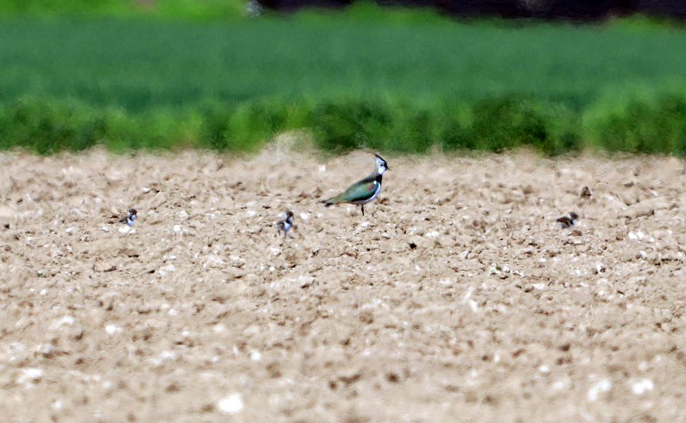 Auf dem Kiebitzfeld „Gut Brüggen“ bei Bramey sind die ersten Kiebitze geschlüpft. 3 Küken konnte ich feststellen, >2 weitere Gelege werden noch bebrütet. Die Markierung der Gelege scheint sich erstmal gelohnt zu haben, denn eine Feldbearbeitung hat mittlerweile stattgefunden. Ob auf der trockenen Ackerwüste ein Überleben der Jungkiebitze möglich ist, werden die nächsten Tage zeigen.