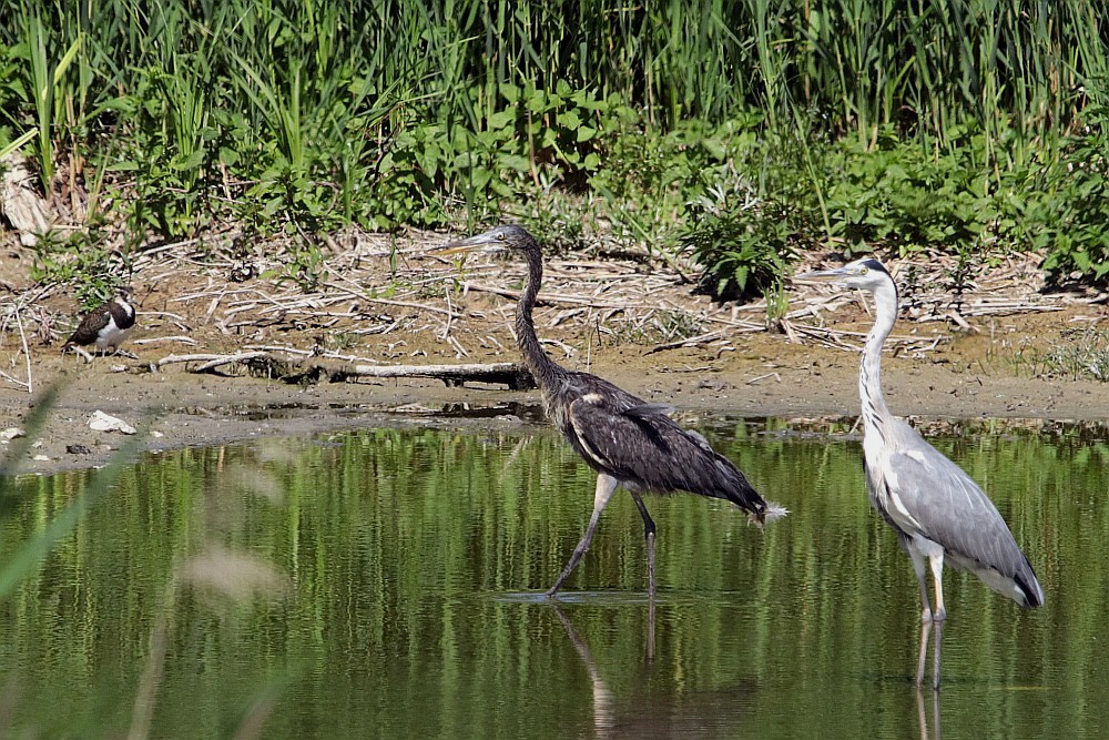 Im HRB der Seseke fiel mir unter den >8 Graureihern ein sehr dunkel gefärbter Reiher auf, wahrscheinlich ein Jungvogel, der etwas aus der Art geschlagen erscheint, ein Purpurreiher dürfte eher brauner gefärbt sein. Über dem Becken >25 Mauersegler, ~10 Rauch- und ~10 Mehlschwalben. Am Ufer 6 Kiebitze, 2 Waldwasserläufer und 6 Bachstelzen. In der Seseke Teichhühner mit 6 Küken.