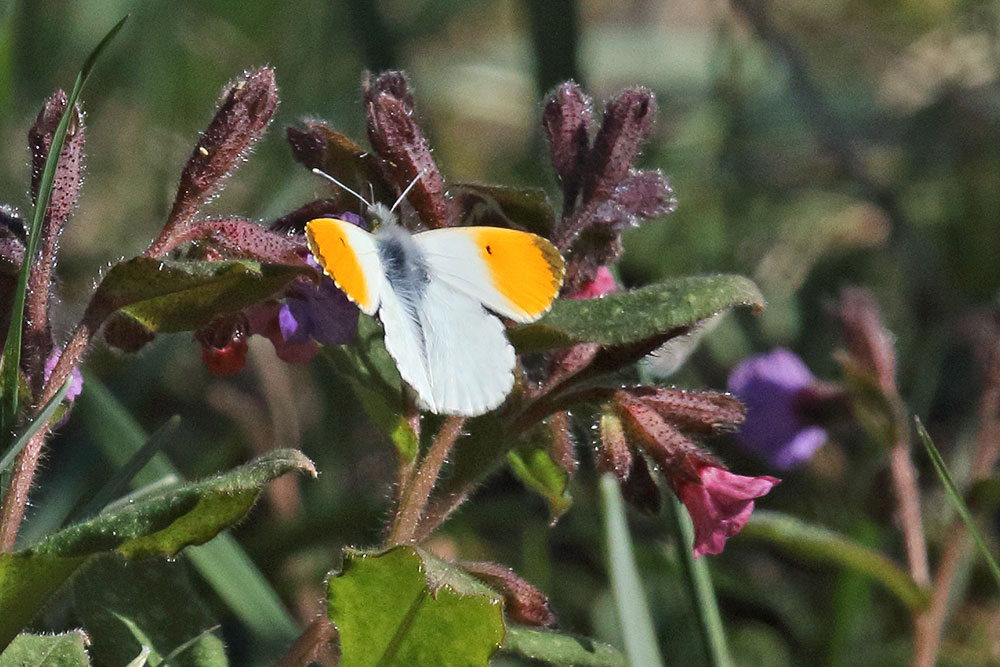 Nach C-Falter, großem Fuchs, Zitronenfalter und Tagpfauenauge hat uns heute auch erstmals in diesem Jahr ein Aurorafalter besucht. Das Männchen flog Blüten der gerade aufgeblühten Lunaria und des Kaukasischen Vergissmeinnichts an.