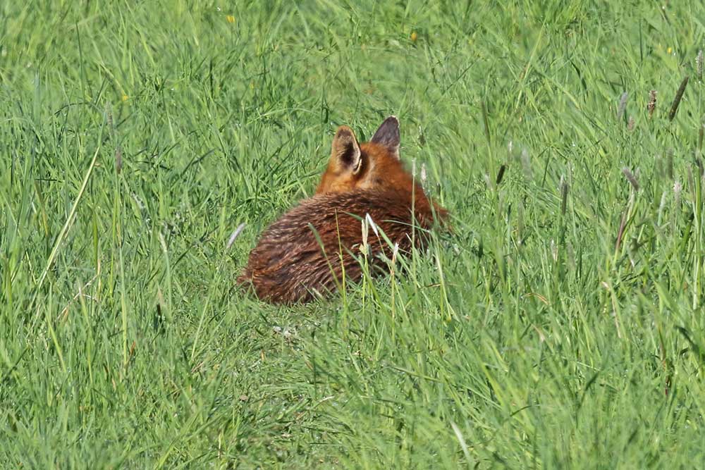 In diesem Jahr sieht man weniger Aurorafalter als sonst gewohnt. Die wechselnden Wetterextreme der zurückliegenden Wochen könnten hierfür ein Grund sein: nachdem die letzte Märzdekade bereits bis 18 °C hervorgebracht hatte (ein erster Aurorafalter flog bereits am 27.03. in unserem Garten), kam dann in den ersten Apriltagen der Winter mit fast 20 cm geschlossener Schneedecke zurück …, (Hemmerder Schelk), 27.04.2022 (Foto: Bernhard Glüer) Hier döst etwas „Haariges“ in der noch schwachen Morgensonne (UN-Kessebüren) …, 27.04.2022 (Foto: Bernhard Glüer) … ein völlig entrückter Fuchs scheint noch von besseren Zeiten zu träumen …, 27.04.2022 (Foto: Bernhard Glüer) … scheinbar widerwillig kehrt er aus dem Reich der Träume in die Wirklichkeit zurück …, 27.04.2022 (Foto: Bernhard Glüer) … auch den „stalkenden Paparazzo“ nimmt er nur ungläubig zur Kenntnis. Füchse verlassen sich im Zweifel eher auf ihre Nase. Weht der Wind aus der falschen Richtung, sind sie bei unbeweglichen „Objekten“ oft erstmal ratlos, 27.04.2022 (Foto: Bernhard Glüer) Kiebitzattacke gegen eine überfliegende Rohrweihe (w) in den Hemmerder Wiesen …, 29.04.2022 (Foto: Bernhard Glüer) … auch die Weißstörche sind als Kükenräuber gefürchtet und werden attackiert, 29.04.2022 (Foto: Bernhard Glüer) Zwei von mindestens 8 Thunbergschaftstelzen bei Steinen-Moskau …, 29.04.2022 (Foto: Bernhard Glüer) … dieses sehr dunkelköpfige Exemplar kommt einer Maskenschafselze schon sehr nahe …, 29.04.2022 (Foto: Bernhard Glüer) … diese hätte allerdings im Nacken eine scharf abgesetzte Grenze zum schwarzen Kopf …, 29.04.2022 (Foto: Bernhard Glüer) … trotzdem stiftet die farbliche Variabilität schon Verwirrung. Man beachte bei diesem Exemplar das ausgeprägte Weiß an Kehle und Wangen …, 29.04.2022 (Foto: Bernhard Glüer) … hier ist in der Kopfplatte mehr Grau zu sehen und vor dem Auge ein winziger weißer Fleck (wie aucdh schon bei dem oben gezeigten Vogel), 29.04.2022 (Foto: Bernhard Glüer) „Albtraum Waschbär“: statt einer erhofften Greifvogelbrut findet man immer öfter – wie im Falle dieses Habichthorstes (Hemmerder Schelk) solche schlafenden „Fellnasen“, vor denen derzeit kaum eine Vogelbrut sicher ist, 27.04.2022 (Foto: Bernhard Glüer)