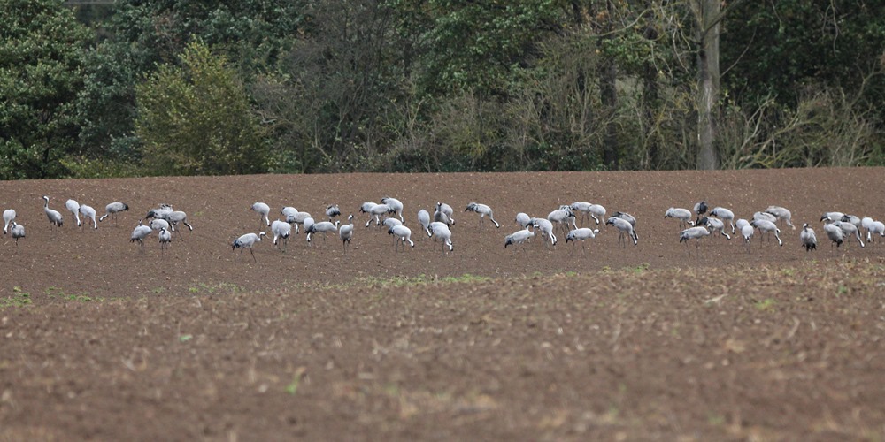 Gestern Morgen rasteten südlich von Fröndenberg und der Ruhr auf einem abgeernteten Maisfeld bei Menden-Halingen 94 Kraniche , darunter vier diesjährige Vögel. Die gesamte Gruppe setzte ihren Zug vormittags in westlicher Richtung fort.