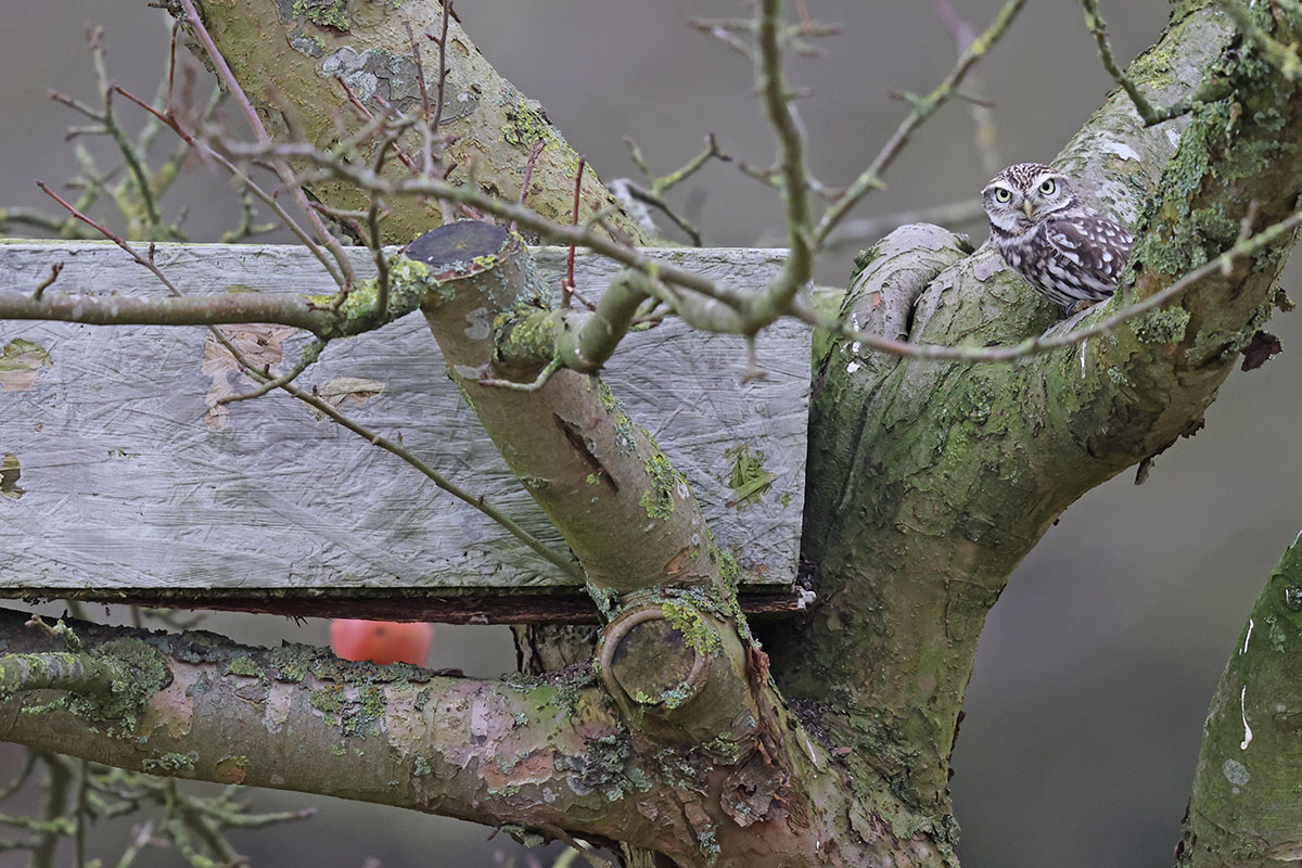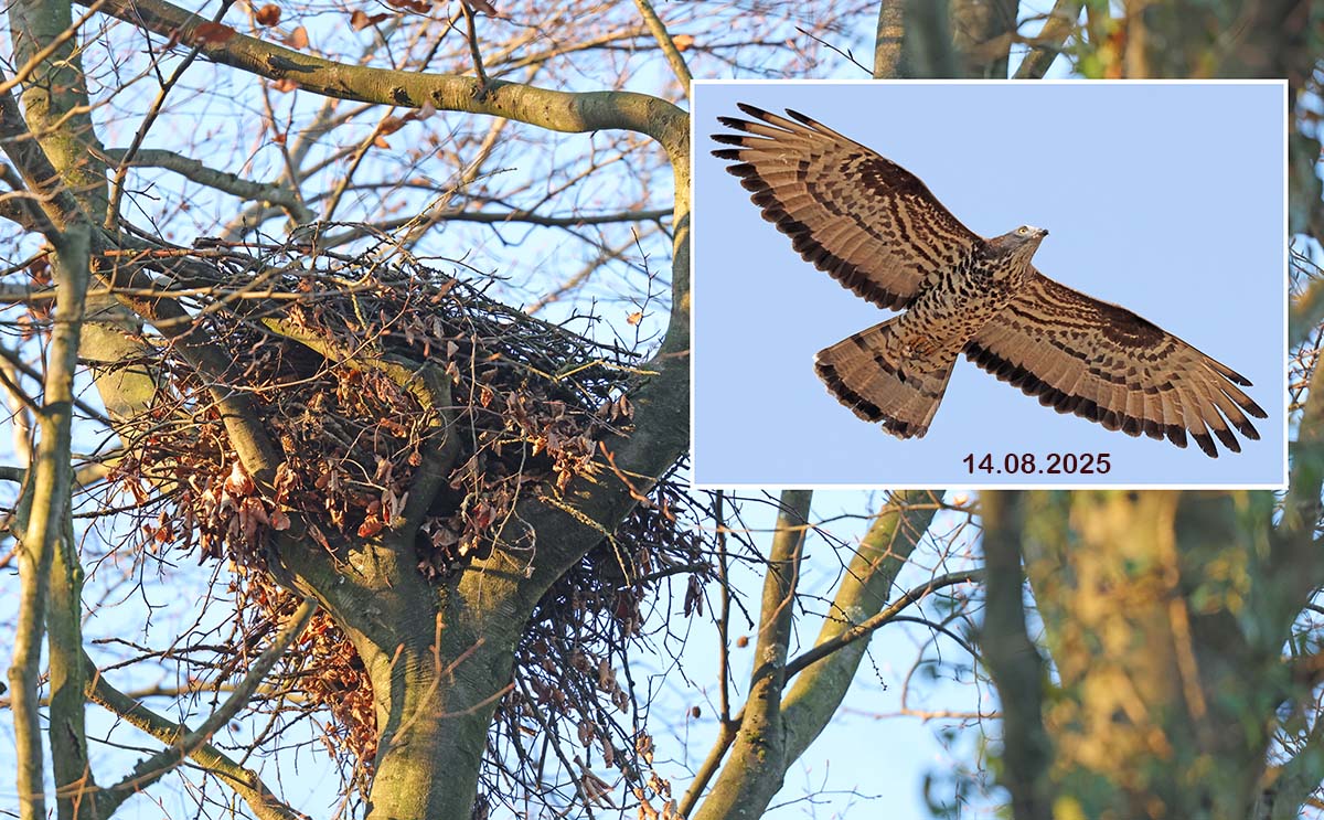 Ausgesprochen erfreulicher „Beifang“ während vieler Waldwanderungen war außerdem in den jetzt laubfreien Baumkronen die Entdeckung eines Wespenbussardhorstes. In vielen Meldungen des Spätsommers war wegen einer Reihe von Beobachtungen immer wieder vom Brutverdacht eines Paares nahe Frdbg.-Bausenhagen die Rede. Mindestens einmal wurde dieser Verdacht auch durch die Beobachtung von Wabentransport erhärtet. Horstsuchen der letzten Wochen um Bausenhagen blieben jedoch erfolglos. Jetzt gelang eher zufällig gut 3 km entfernt (für Wespenbussarde keine nennenswerte Distanz!) der Fund eines gut erhaltenen Horstes, der offenbar in diesem Jahr erst neu errichtet worden ist und deutlich sichtbar komplett aus belaubten Zweigen besteht.