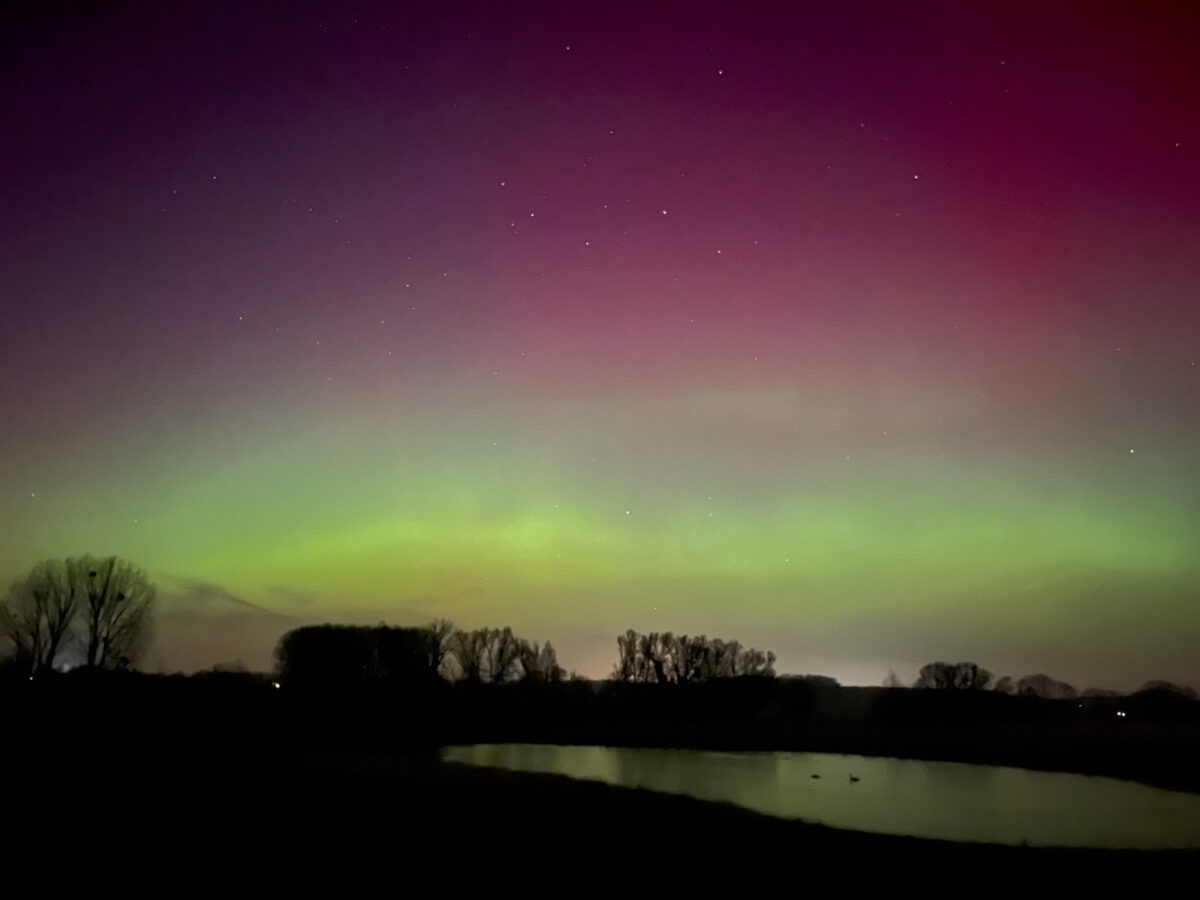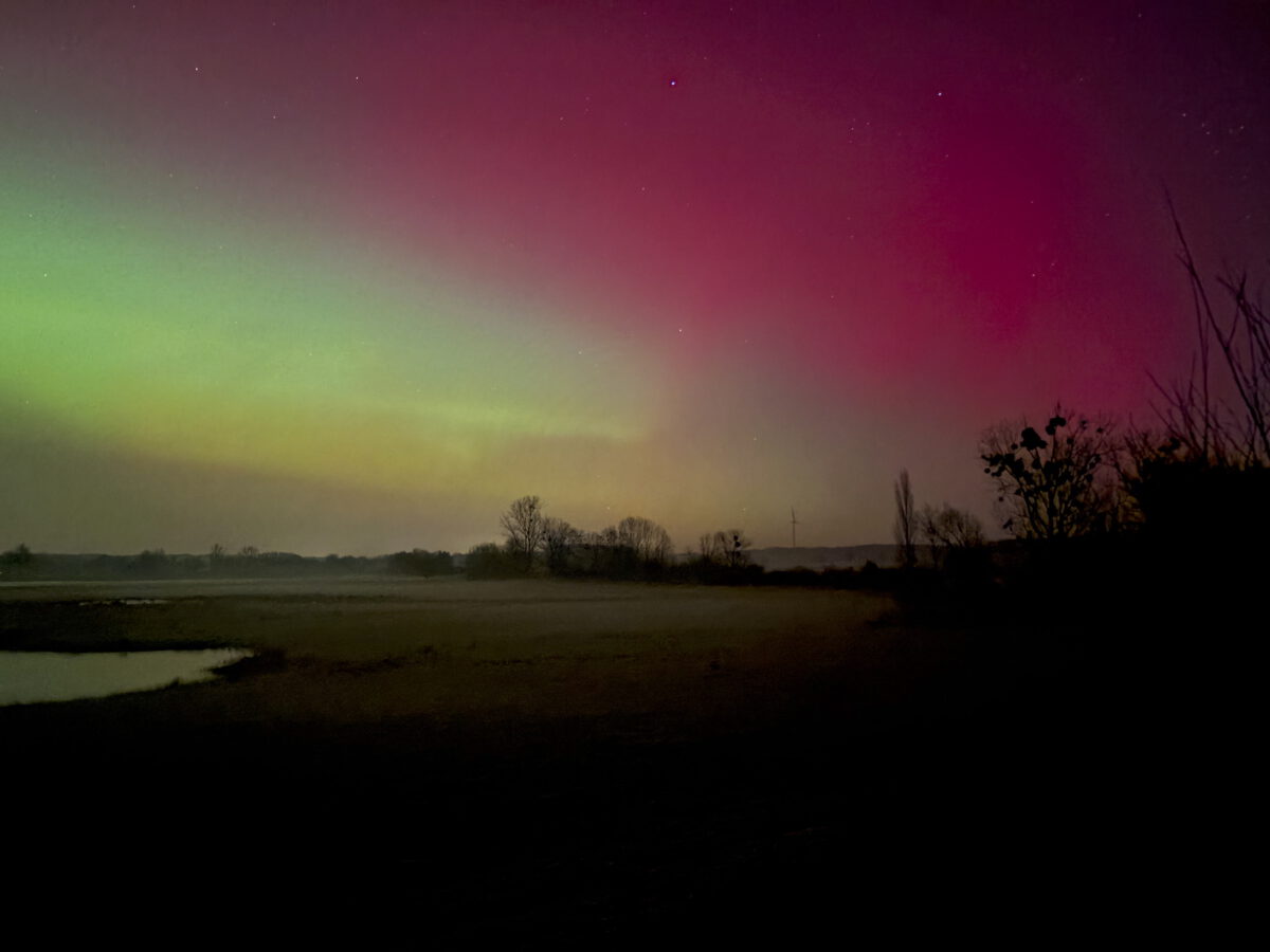 Am 19. Januar gegen Mitternacht tanzten nach einem besonders intensiven Sonnensturm mit bloßem Auge sichtbare Nordlichter über den Hemmerder Wiesen. Die Gänsegemeinschaft bildete zur Lichtshow einen stimmungsvollen Klangteppich unterm sternklaren Himmel. Ich konnte nur wenig dazu herausfinden, wie die Vögel die Störungen im Magnetfeld wahrnehmen – ihr Navigationssystem ist Messungen zufolge von derart starken Ereignissen aber beeinträchtigt. Blässgänse gelten auch im Nachtlager als relativ „gesprächig“, deshalb weiß ich nicht, ob das durchgehende Geschnatter mit dem Weltraumwetter zusammenhing. Es war jedenfalls ein herausragendes Naturerlebnis. (Foto vom Aussichtshügel aufgenommen, Daniela Kleiböhmer)