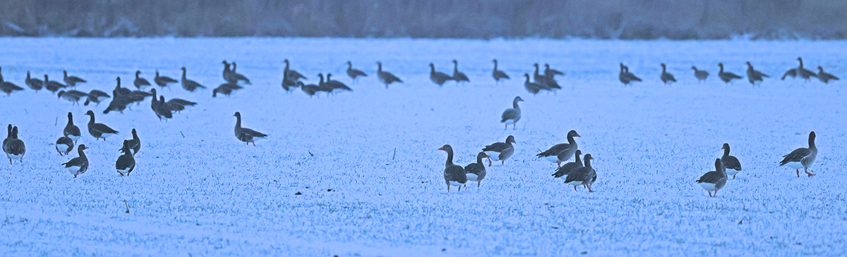 Zu später Stunde – nahe dem Sonnenuntergang – in den Hemmerder Wiesen überraschende Gäste bei Eis und Schnee: 2 Große Brachvögel und 2 Singschwäne, neben den gewohnten Protagonisten der letzten Tage, ~ 80 Krickenten, > 100 Stockenten, 2 Spießenten, <10 Schnatterenten, 2 Höckerschwäne, mehrere Hundert Gänse – vor allem Blässgänse (auf umliegenden Feldern).