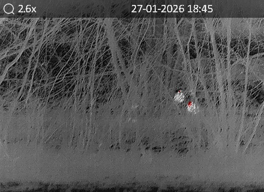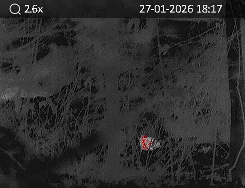 Ein aufregender „Klecks“ unweit unserer Haustür (Frdbg.-Hohenheide) mit Wärmebild-Technik in abendlicher Dunkelheit sichtbar gemacht: eine ruhende Waldschnepfe, 27.01.2026 (Foto: Bernhard Glüer)