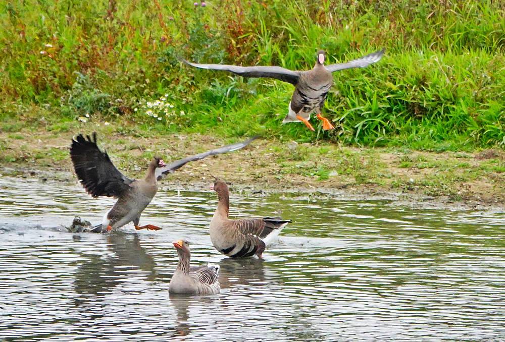 Die erst kürzlich erfolgte Mahd im Gebiet führt ganz offensichtlich dazu, dass die Kiebitzwiese bei Gänsen wieder an Attraktivität gewinnt. Neben stationären 44 Nilgänse und 138 Graugänsen überflogen in einen weiteren Graugans-Trupp die ersten 5 Blässgänse in diesen Herbst flach die Kiebitzwiese.