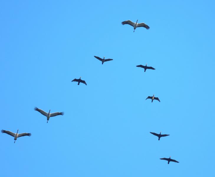 Gemischter Kranich- und Kormorantrupp über die Hemmerder Wiesen fliegend (Foto: Hartmut Brecher)