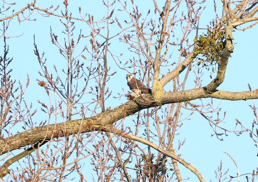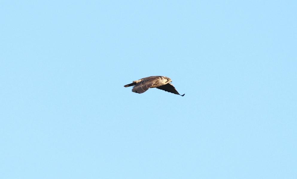 Wanderfalke verlässt nach seiner Mahlzeit die Hemmerder Wiesen (Foto: Hartmut Brecher)