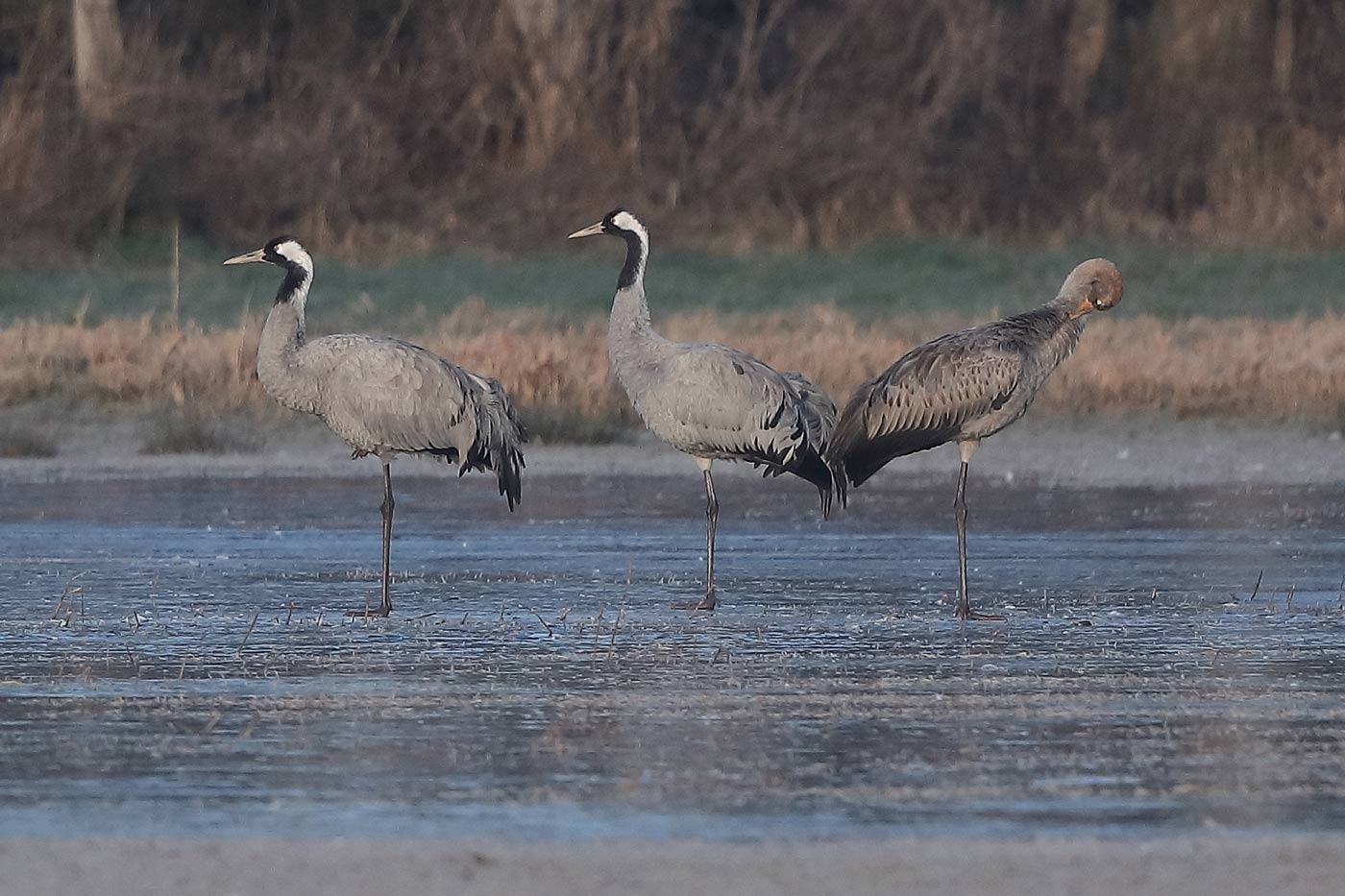 Nach dem Temperatursturz vor ein paar Tagen haben die zuvor in großer Zahl in den Hemmerder Wiesen rastenden Gänse und Enten das Gebiet weitestgehend geräumt. Nur sechs Stockenten hielten sich heute auf der nicht zugefrorenen Amecke auf. Die Eisfläche in der Kernzone hat dennoch ein Kranichpaar mit Jungvogel nicht davon abgehalten, hier die Nacht zu verbringen (Mitbeobachter: G. Herber-Busch). Außerdem ca. 45 Lachmöwen mit einzelnen Sturmmöwen gen Osten überhinfliegend sowie ein Schwarzspecht.