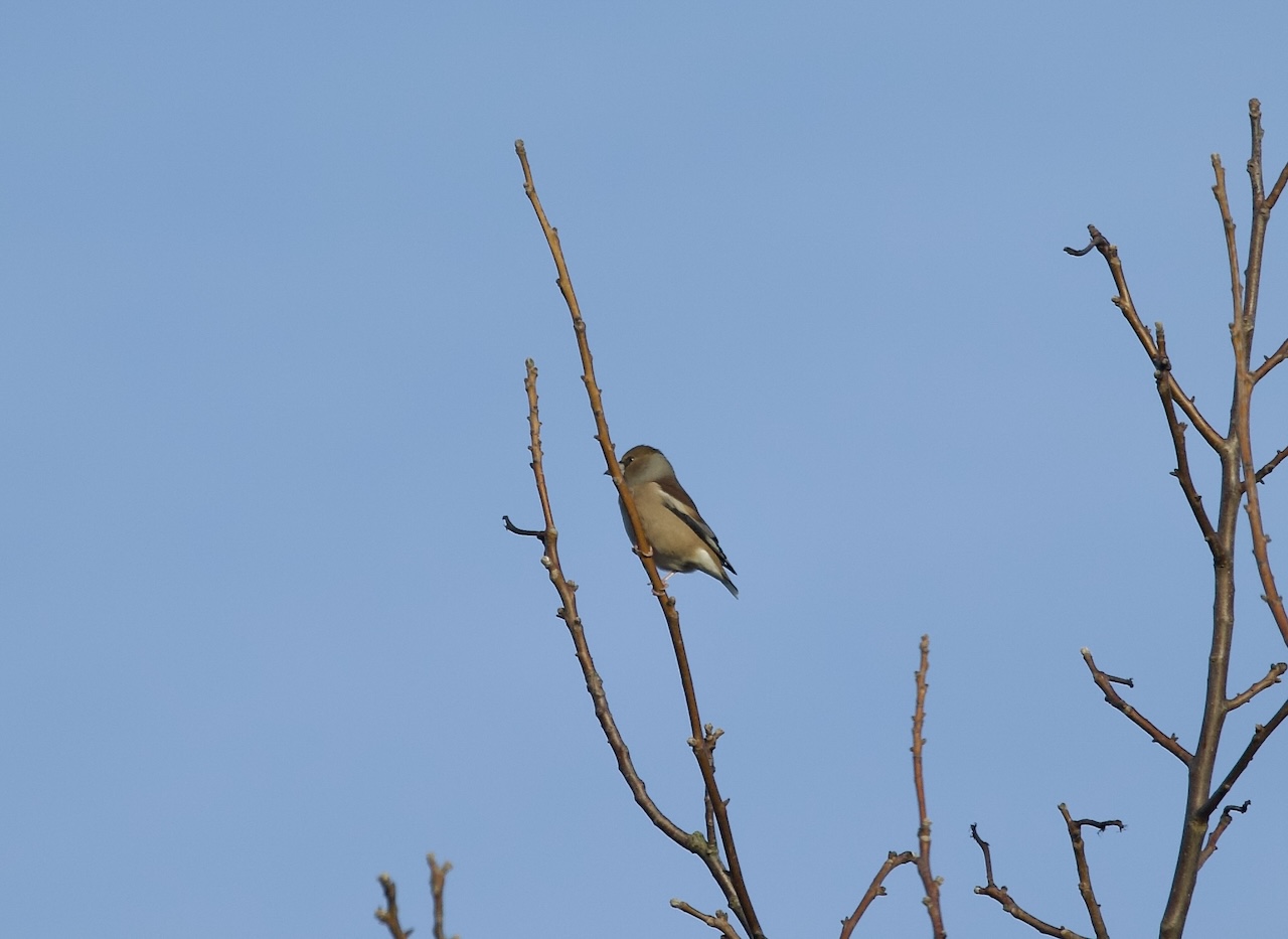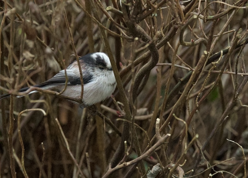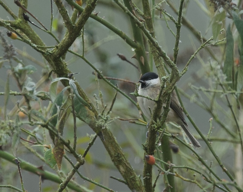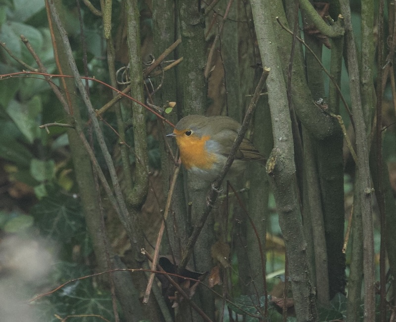 Im eigenen Garten wenige Vögel: 1 Rotkehlchen, 1 Wintergoldhähnchen, 2 Rabenkrähen, 2 Elstern, 2,1 Amseln im Pfaffenhütchen, 1 Fasan M.